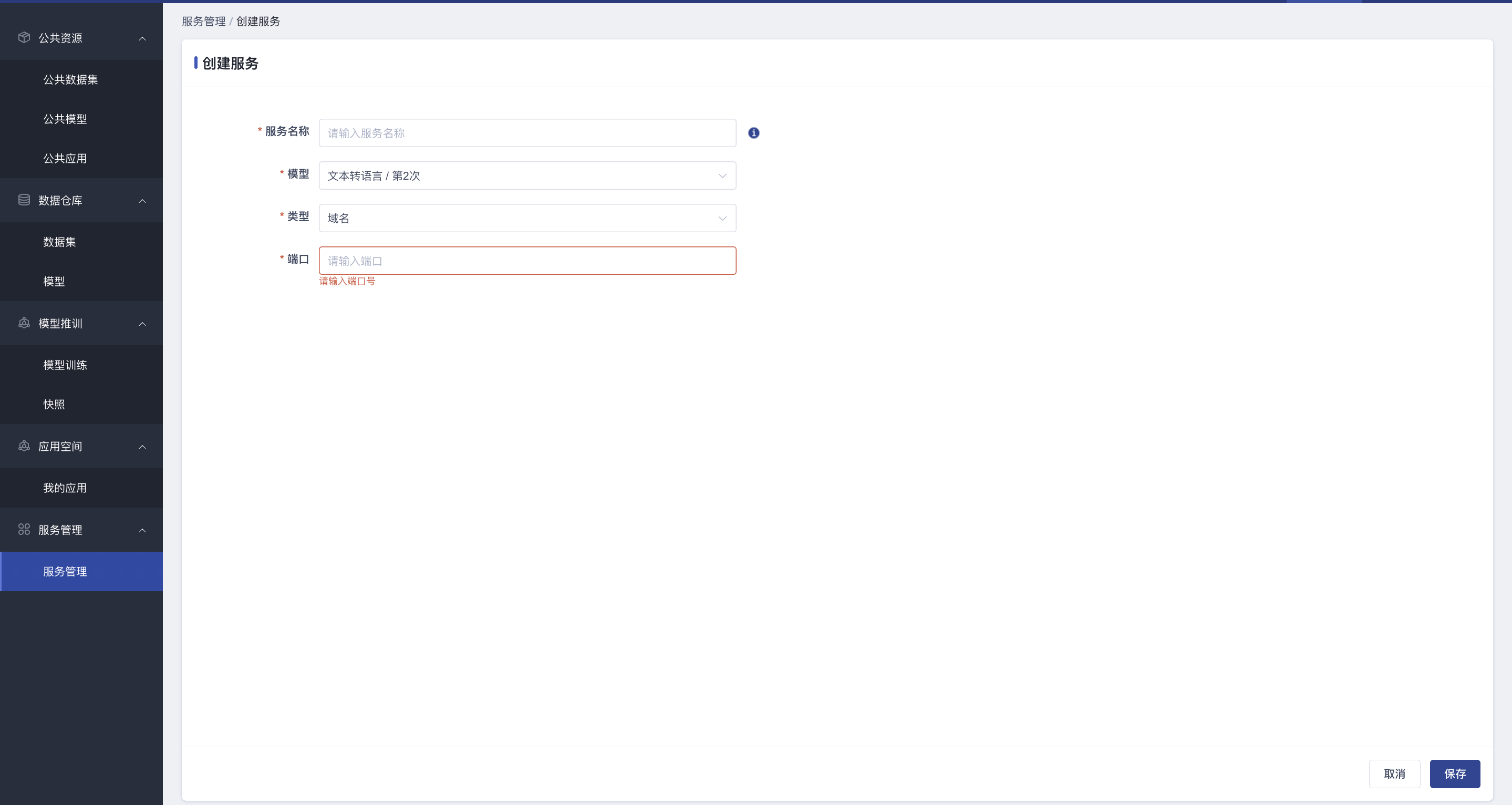 点击创建服务、选择模型和服务类型、输入端口即可创建成功对外提供的API接口服务