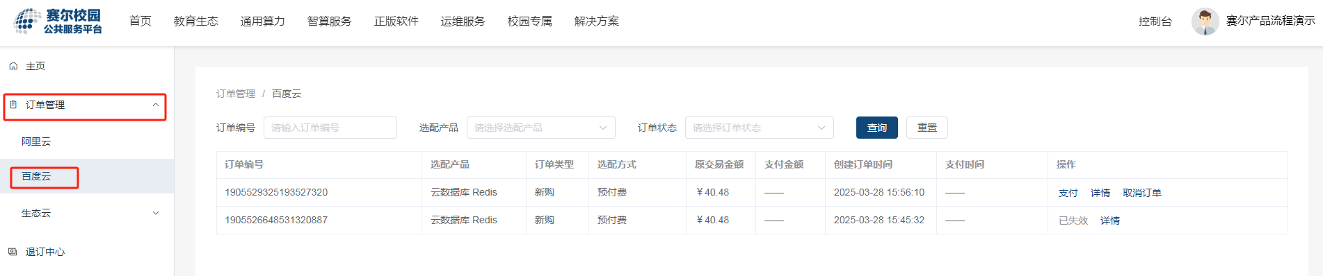 4.查看订单,确认您已购买的云产品。未支付订单可再次点击去支付。