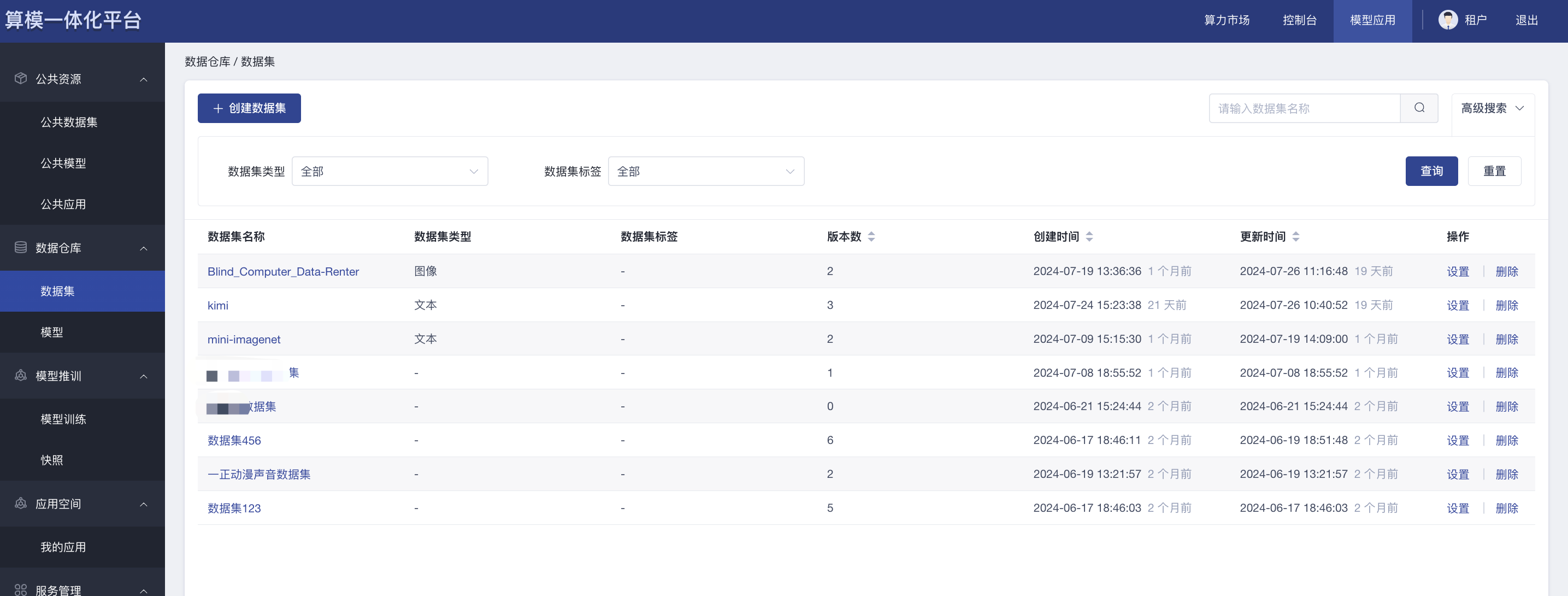登录租户账号,点击【数据仓库-数据集】进入页面,该功能可增删改查管理私有数据集